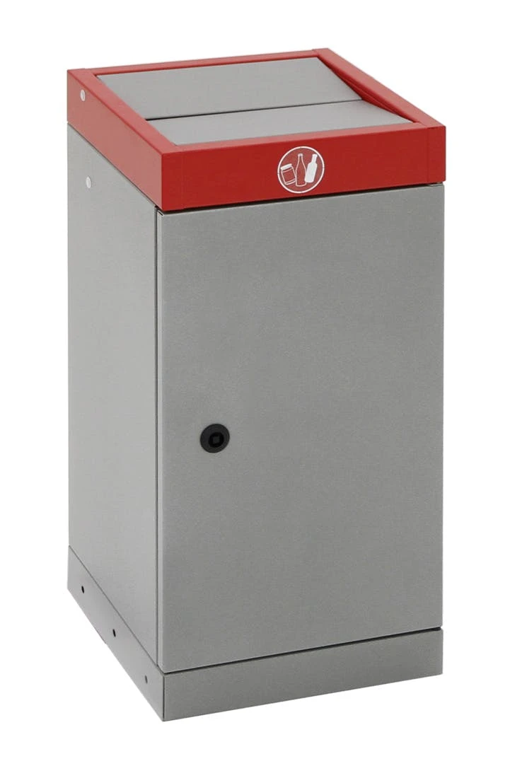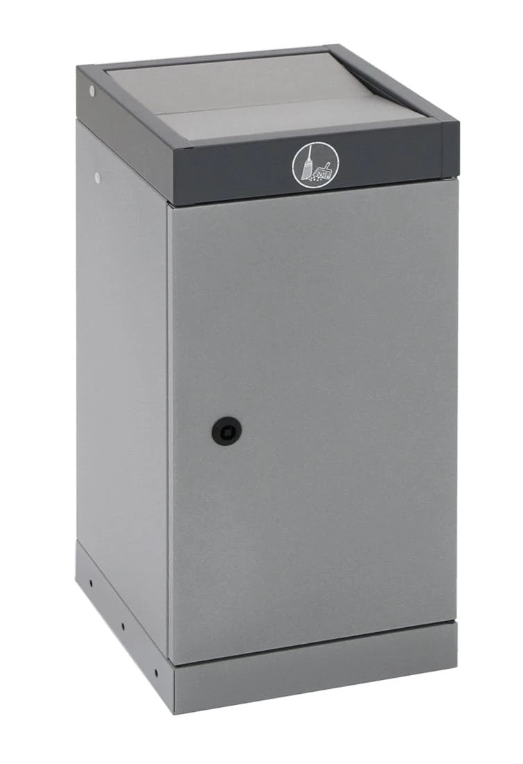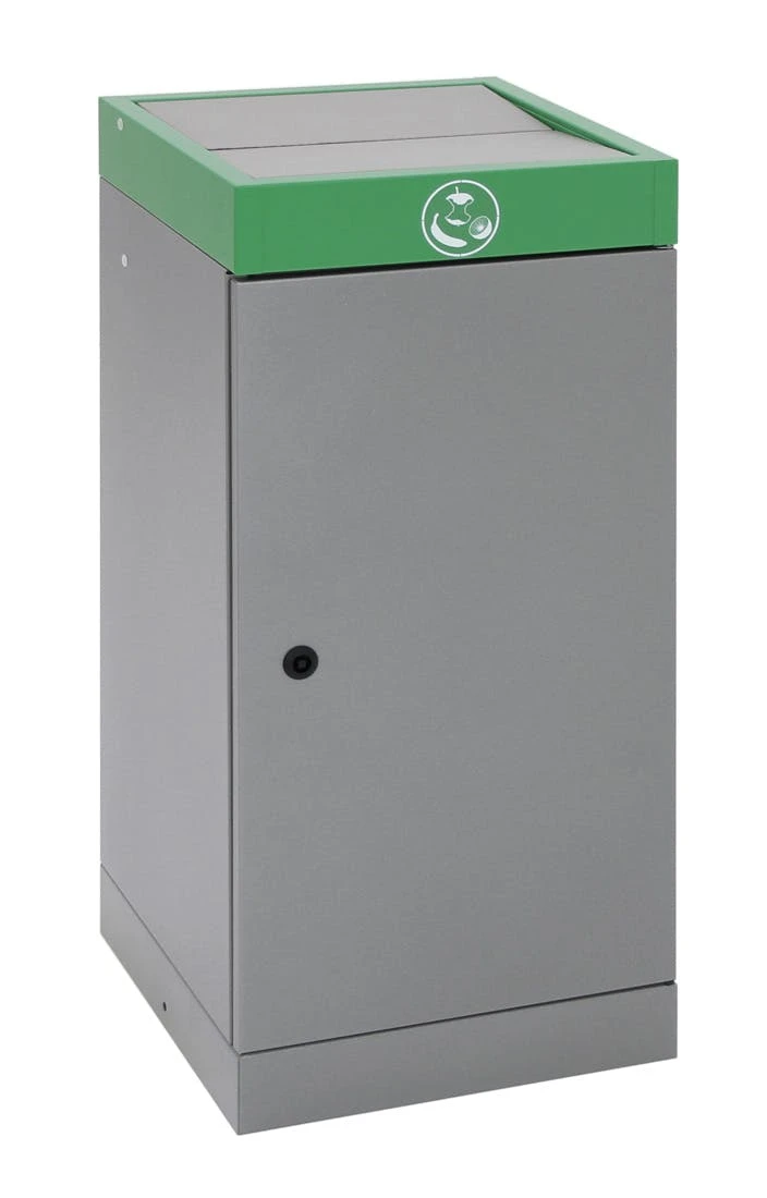 Einfachster Abfalleinwurf möglich: Aus vollständig verzinktem Qualitätsstahlblech gefertigt und strukturiert pulverbeschichtet. Die beiden Schwingdeckel öffnen nach unten, so dass der Abfall nahezu berührungslos eingeworfen werden kann. Feuer und geruchshemmend. Innenbehälter aus verzinktem Stahlblech, Fassungsvermögen 30 Liter. Der Innenbehälter wird durch eine frontseitig eingelassene und per Vierkantschloss verschließbare Flügeltüre entnommen (Vierkantschloss wird mitgeliefert). Zwecks höherer Sortiersicherheit ist das gesamte Kopfelement farbig beschichtet. Frontseitig sorgen 2 Stellfüße für den Ausgleich bei Bodenunebenheiten (Niveauregulierung). Der Behälter kann mit dem Rollensatz Art.-Nr. 5407000 auch nachträglich zur fahrbaren Variante umgerüstet werden. Dann beträgt die Gesamthöhe 700 mm. Der Artikel wird vollständig in Deutschland gefertigt und in einer TÜV-kontrollierten Produktionsstätte hergestellt. Der Hersteller gewährt eine Garantie von 5 Jahren. Außerdem ist der Behälter als nicht brennbar eingestuft (DIN 4102, Brandschutzklasse A1 bzw. DIN EN 13501-1). Farbgebung Korpus: graualu-struktur, Farbgebung Kopfelement: verkehrsgrün RAL 6024.
