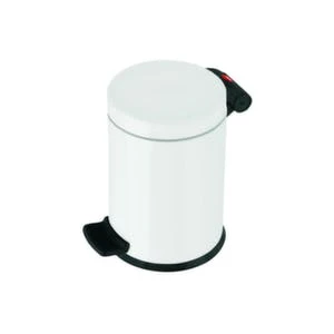 Tretabfallbehälter, Inhalt 4 l, Höhe x Durchmesser 270 x 180 mm, Klappdeckel Öffnung mit Fußpedal, Deckel schließt leise, Innenbehälter aus Kunststoff, Korpus aus Stahl mit Pulverbeschichtung in silber, Deckel aus Stahl mit Pulverbeschichtung in silber, Unterbau Kunststoff-Bodenring, mit GS-Zeichen.