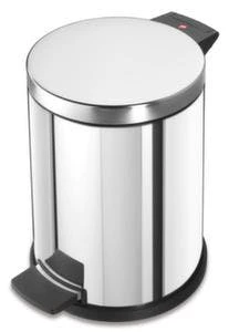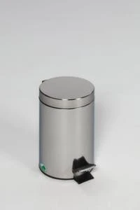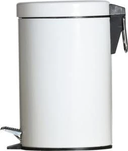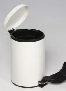 Tretabfallbehälter, Inhalt 3 l, Höhe x Durchmesser 270 x 167 mm, Klappdeckel Öffnung mit Fußpedal, Innenbehälter aus Kunststoff, einfache Entleerung über Deckel, Korpus aus Metall mit Pulverbeschichtung in weiß, Deckel aus Metall mit Pulverbeschichtung in weiß, Tragegriff.