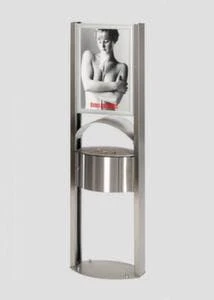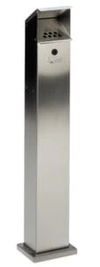 Edelstahl-Standascher, Höhe x Breite x Tiefe 1200 x 580 x 350 mm, aus Edelstahl, Aschereinsatz Inhalt 15 l, Aschereinsatz aus Stahl, Innenbehälter verzinkt, mit Schutzdach, verschließbar mit Doppelbartschloss, einfache Entleerung über Tür, mit Platte zur Bodenverankerung, Lieferung inklusive Montagematerial.