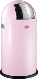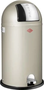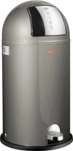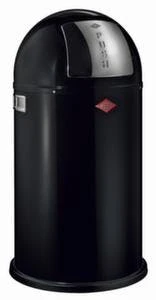 Abfallbehälter, Inhalt 50 l, Höhe x Durchmesser 755 x 400 mm, Push-Klappe Öffnung manuell, Einwurföffnung 330 mm Durchmesser, Innenbehälter aus Metall, Kopfteil aus Stahl mit Pulverbeschichtung in silber, einfache Entleerung über herausziehbaren Innenbehälter, Korpus aus Stahl mit Pulverbeschichtung in silber, Deckel aus Edelstahl, Unterbau Kunststoff-Bodenring.